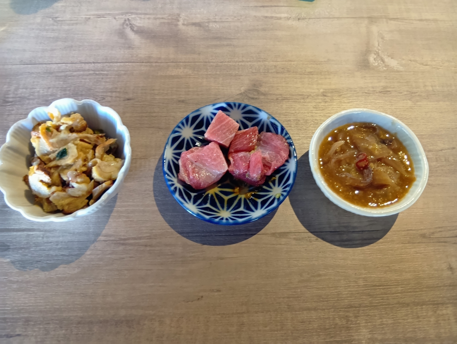 どれも食べたい物ばかりで迷いましたが、とり皮ポン酢、するめいか生姜醤油漬け、ウオサイさんのぶつ切りマグロの3品を注文しました。ご飯のお供にしてもいいくらいのクオリティーです。ぐいぐいお酒が進んでしまいます。