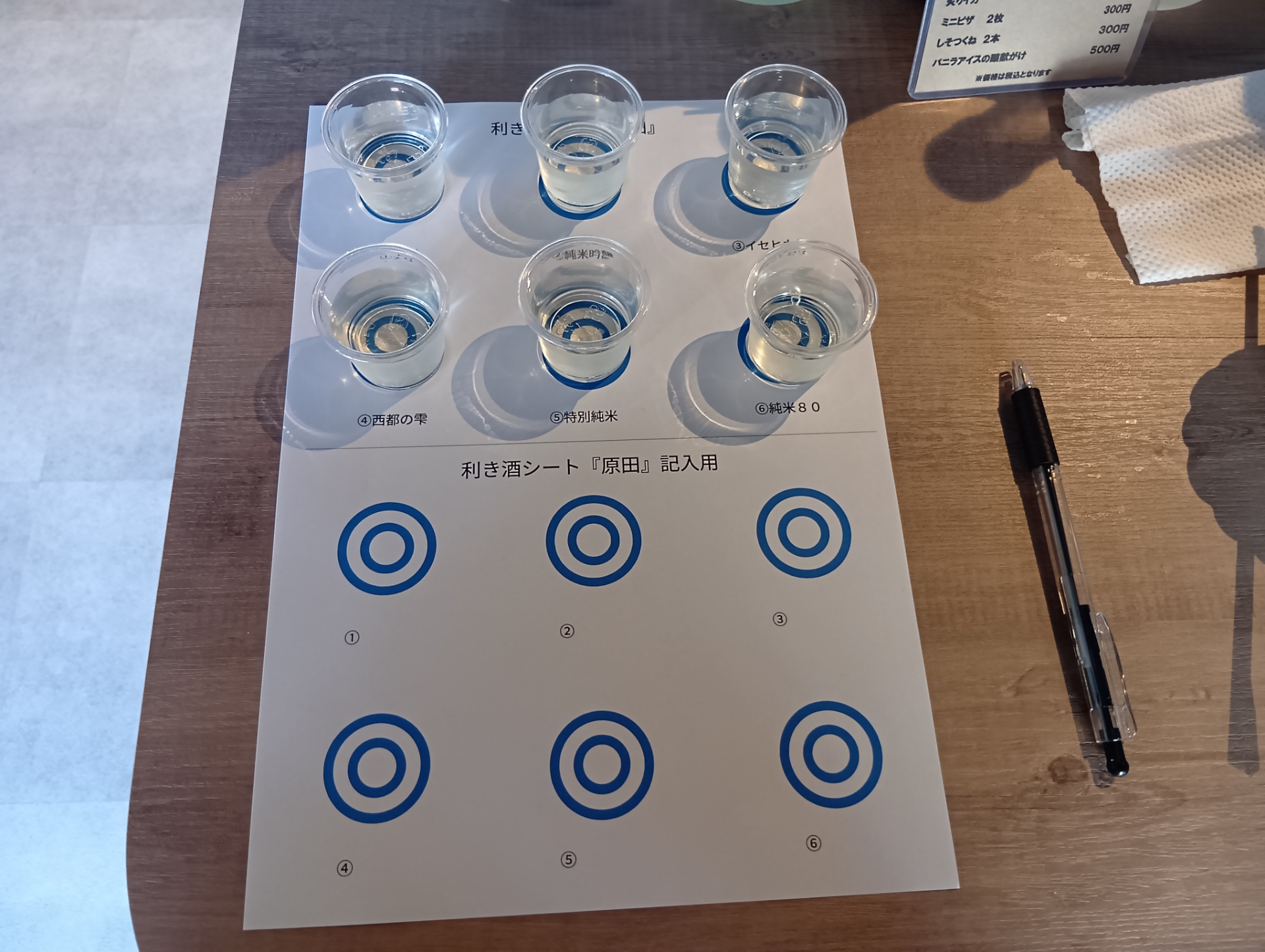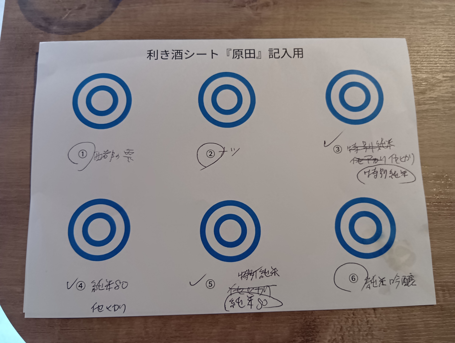 今回の利き酒の題材は、山口県の銘酒「原田」の中から、①ナツ、②純米吟醸、③イセヒカリ、④西都の雫、⑤特別純米、⑥純米80の6種類を当てるものです。