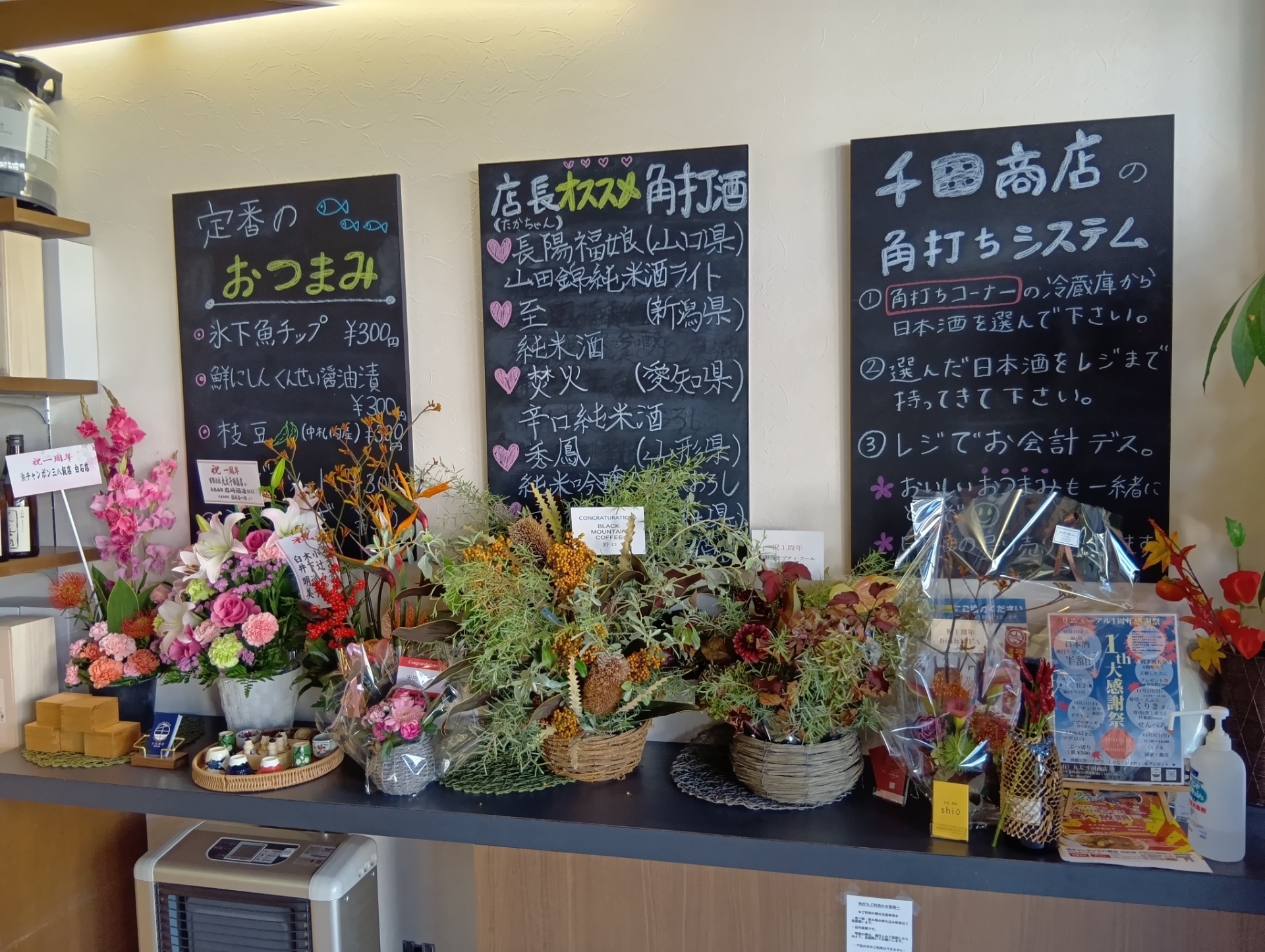 私の散歩ルートにあって、この角打ちをやっているのが、「千田商店(白石区本郷通2丁目南3-10)」という昭和29年創業、3代続く酒屋さんです。地下鉄「白石」駅から10分程度の位置にあり、当社管理物件の「ル・ノール南郷街」からも歩いて近い穴場のお店です。この日は、リニューアルオープン1周年の記念企画をやっていましたので、嫁さんを誘って一緒に角打ちを楽しんできました。