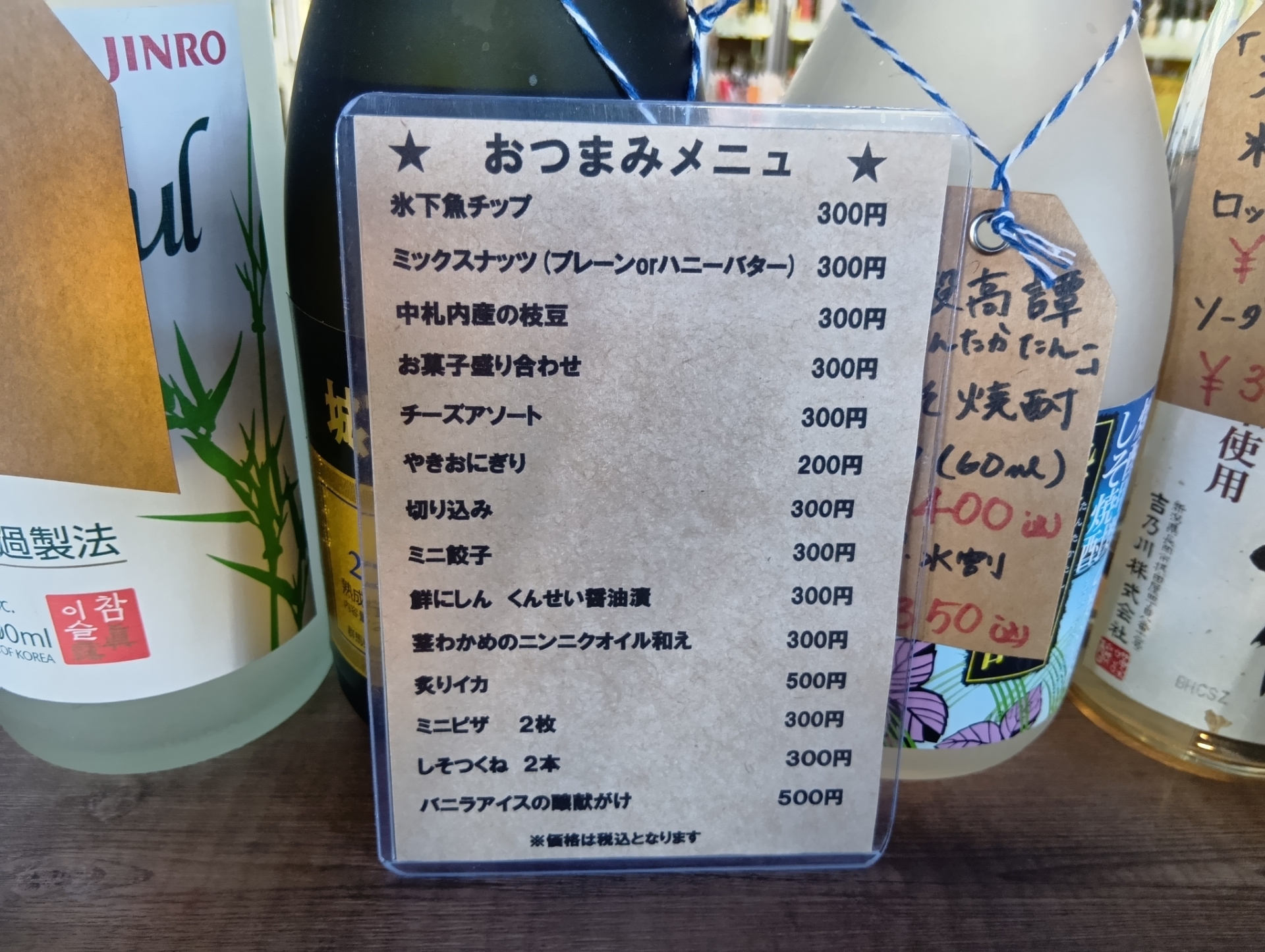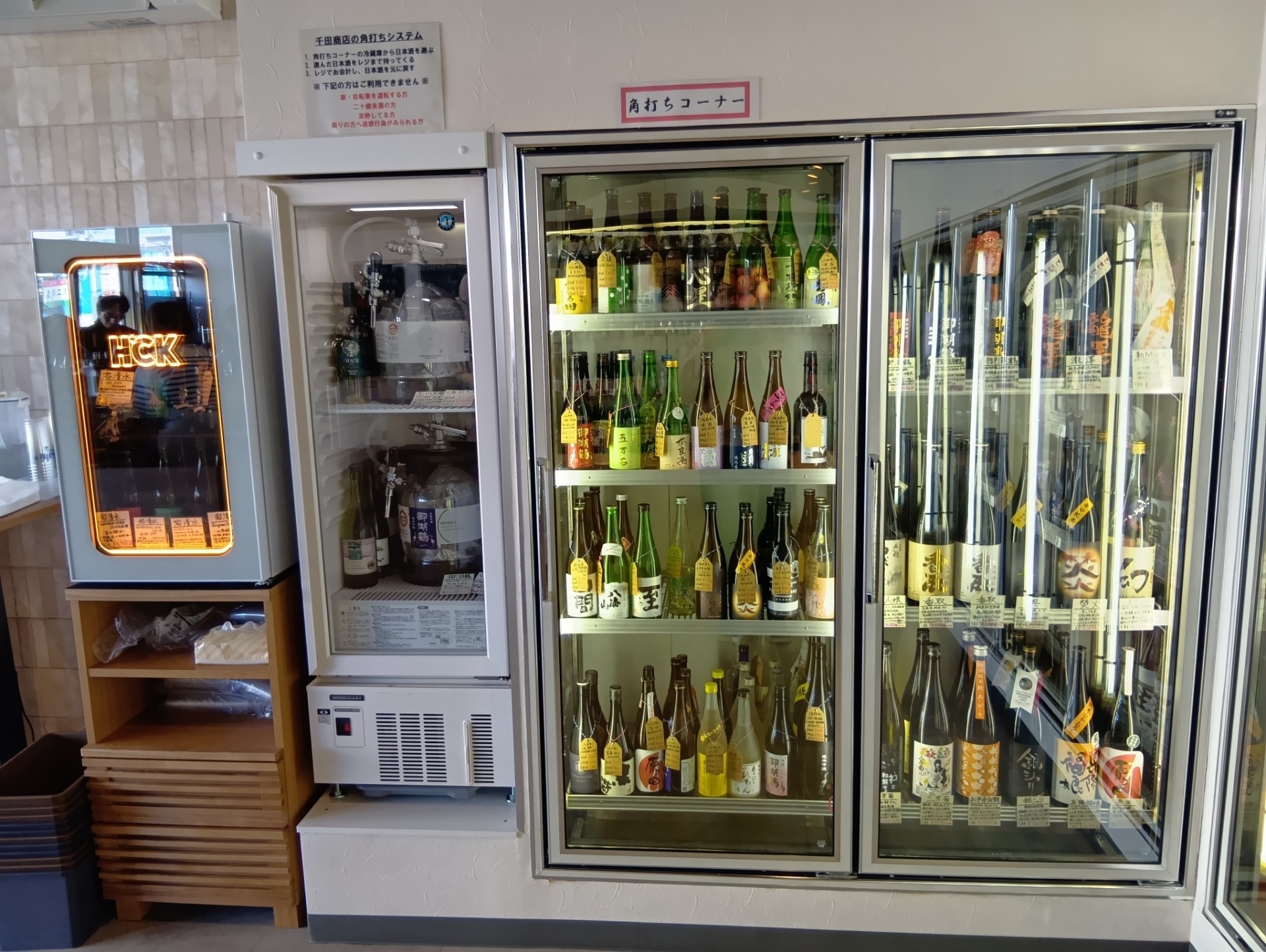 店主さんから最初に「角打ち」の店内ルールをお聞きしました。ショーケースの一部に角打ちコーナーがあり、そこの棚の中から自分が飲みたいお酒を取り出して、レジカウンターまで持って行き、希望する容量を「60ml」、「120ml」、「160ml」から選んで、料金をお支払いする前金制です。
