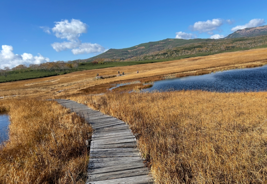 どこまでも続く黄金色の絨毯と木道そして色づいた暑寒別岳