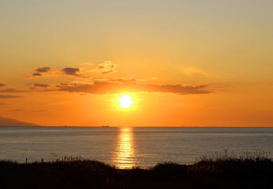 遮蔽物の無い海岸で望む太陽と水平線