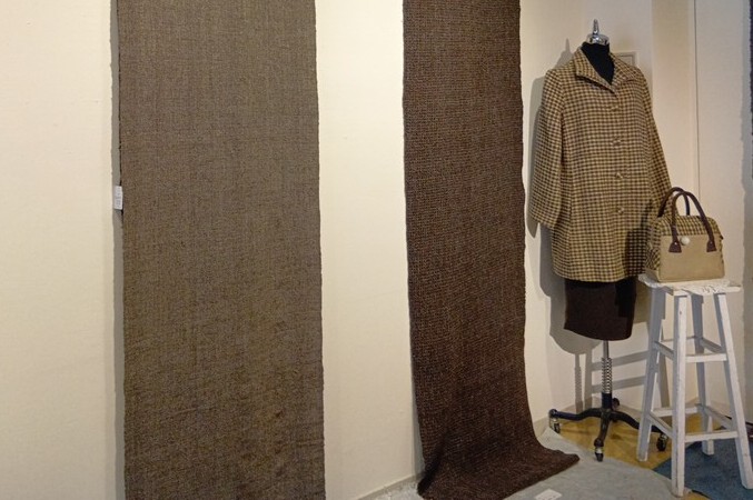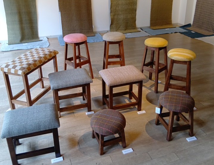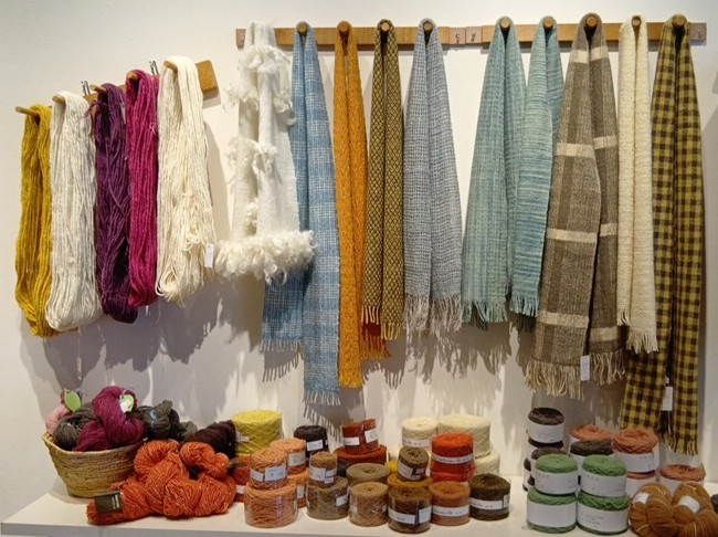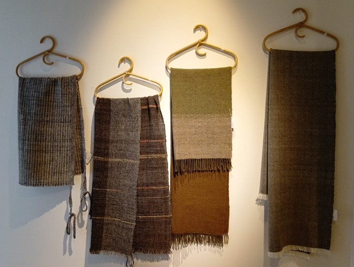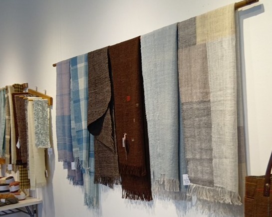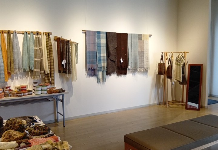 手織りした布地のほか、ストールやマフラー、紡いだ毛糸で編んだ手袋や靴下など約150点が並びます。ぜひご覧ください。