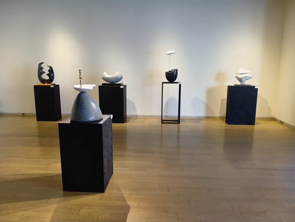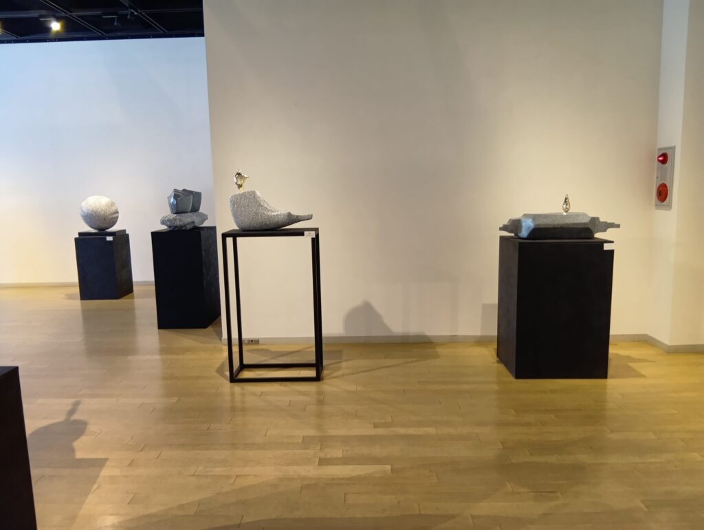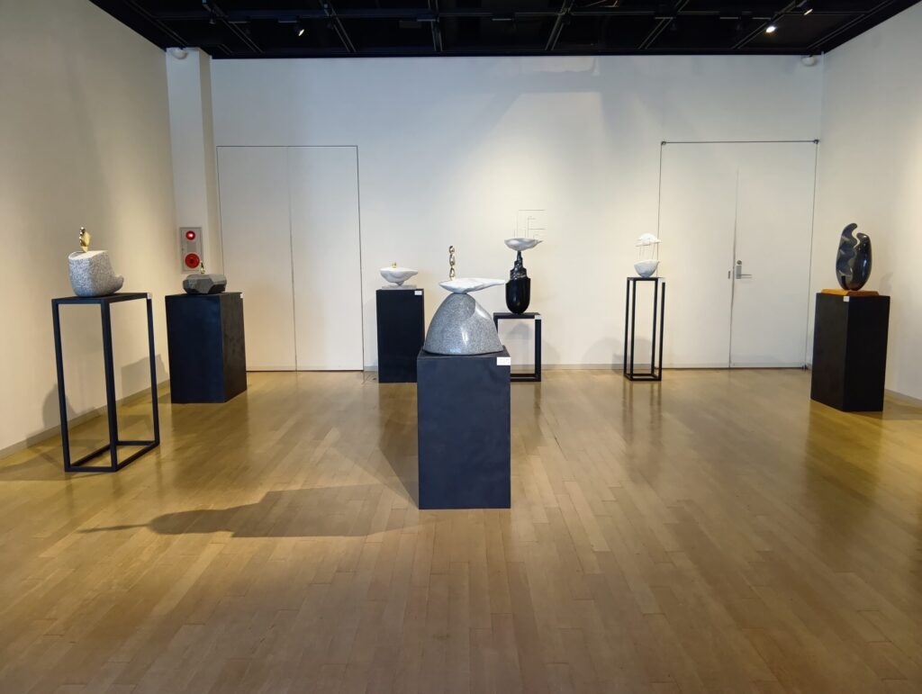 単独の個展として14年ぶりとなる今回は、大理石や御影石などの石材や、真鍮などの金属を組み合わせた彫刻作品を展示しています。