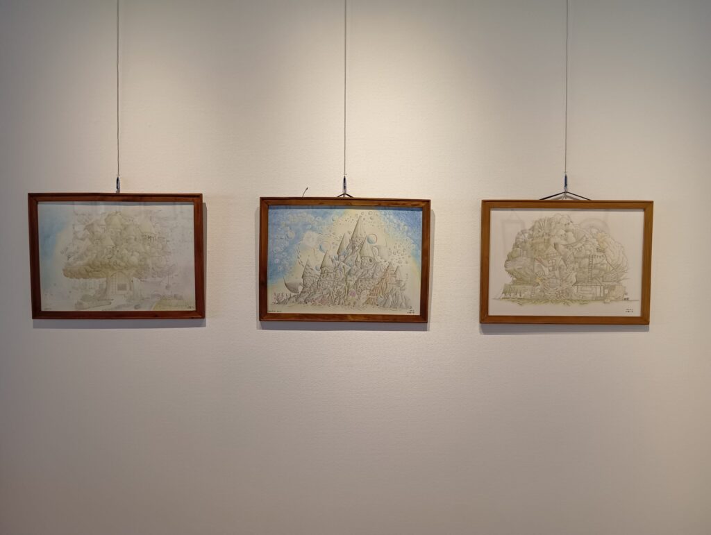 新作絵本「おもいでキャッチャー」の原画に過去の作品を加えた約40点が並んでいます。