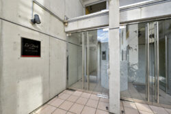 エントランスガラスのテンパードアで解放感UP。コンクリート×ガラス×シルバーでスタイリッシュな造り