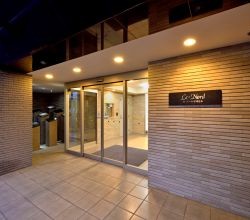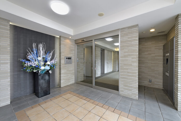 高級感あるエントランス広いエントランス、入口右側にある柱のオブジェと入口左側にある花壇の植栽は夜間になるとライトアップでより重厚な雰囲気を感じる映えるスポットです