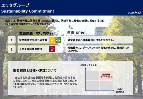 このたび子会社 株式会社TACTは、エッセグループとして北洋銀行と「サステナブル経営支援ファイナンス【目標選択型】」の契約を締結し、2026年3月に私募債を発行いたしました。