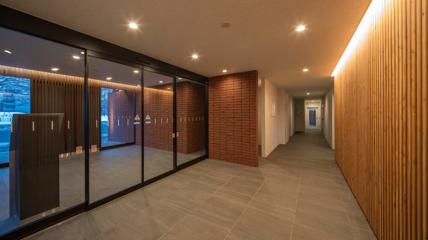 エントランスに入って正面に見える木材は温かみのある道産カラマツを使用しています。道庁や桑園小学校をオマージュした重厚感のあるレンガタイルを使用したエントランスは落ち着きのある空間になっています。